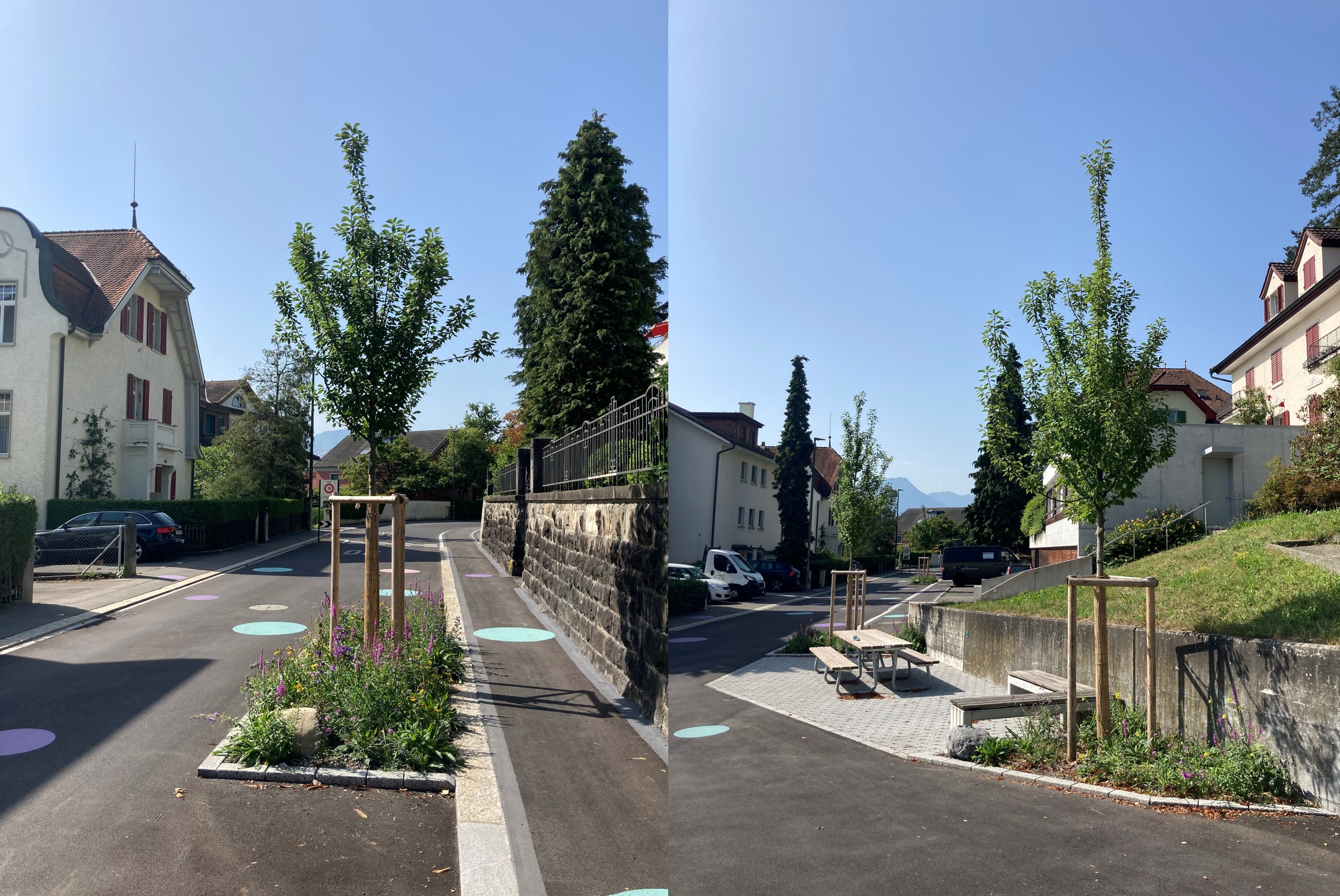 Le superfici deimpermeabilizzate dei marciapiedi, gli spazi verdi aggiuntivi e gli alberi creano un microclima più fresco, favorendo l’evaporazione. Il ruscellamento superficiale è ridotto grazie alla maggiore capacità di infiltrazione e l’acqua piovana viene trattenuta più a lungo nel terreno, a beneficio della vegetazione. Questi effetti sono ulteriormente potenziati dall’installazione di fosse continue, che favoriscono anche la resistenza degli alberi.