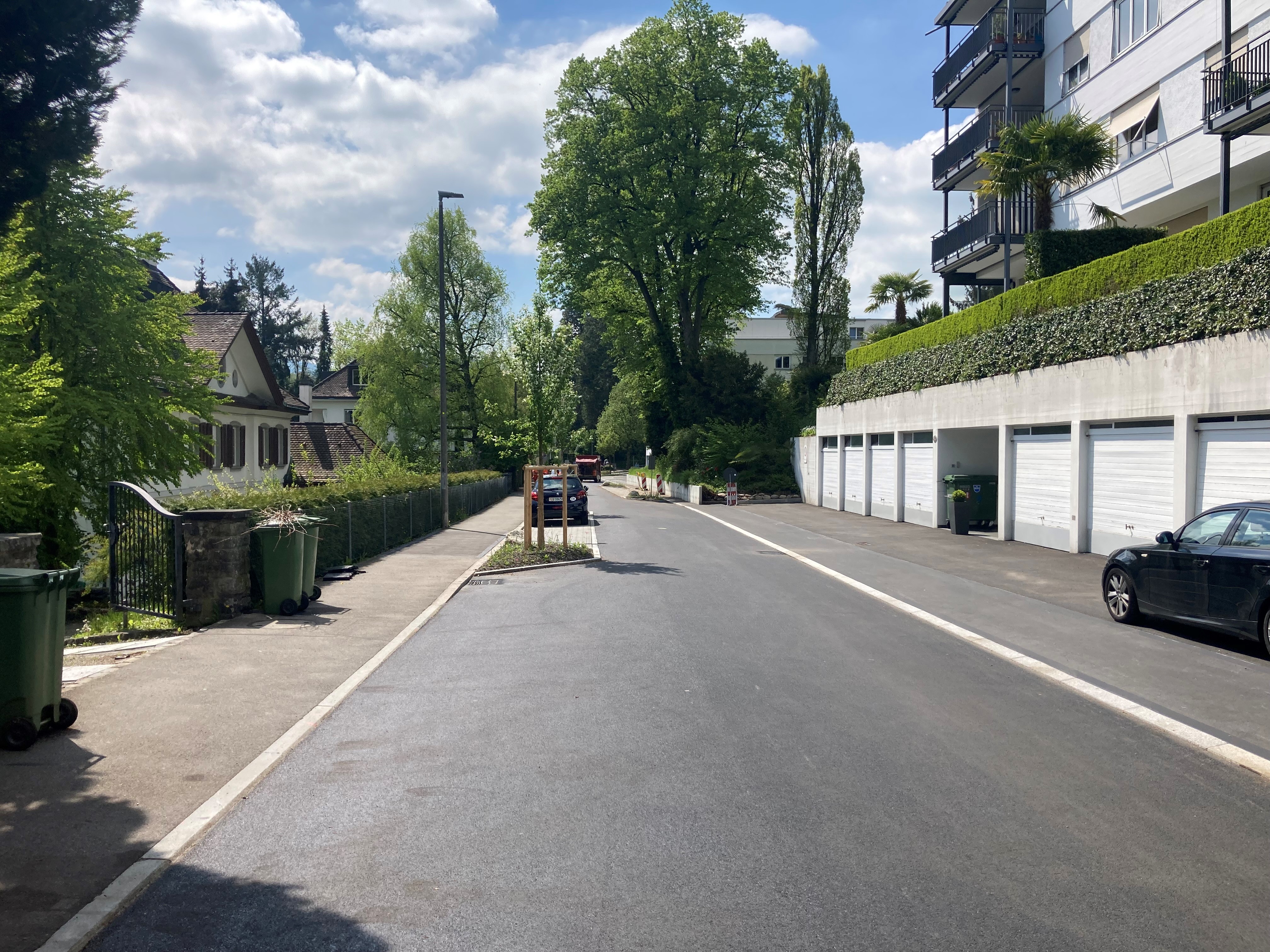 Nell’ambito del Piano Generale di Smaltimento delle acque (PGS), è stato rilevato che la capacità idraulica dell’attuale fognatura della Bergstrasse era troppo bassa in caso di forti precipitazioni. Il corrispondente provvedimento secondo PGS è stato l’elemento scatenante di questo progetto. Le ulteriori esigenze sono state individuate attraverso il coordinamento della pianificazione e la riqualificazione della Bergstrasse è stata oggetto di un progetto complessivo. In questo modo è stato possibile combinare elementi della strategia di adattamento al clima. I parcheggi longitudinali esistenti lungo la strada sono stati delimitati da aiuole alberate e gli spazi sono stati resi permeabili. Lungo la strada sono stati piantati sei nuovi alberi in trincee continue. Ciò favorisce la vitalità degli alberi e consente di immagazzinare una maggiore quantità di acqua piovana. L’evaporazione dalle superfici deimpermeabilizzate, gli spazi verdi aggiuntivi e gli alberi creano un microclima più fresco.