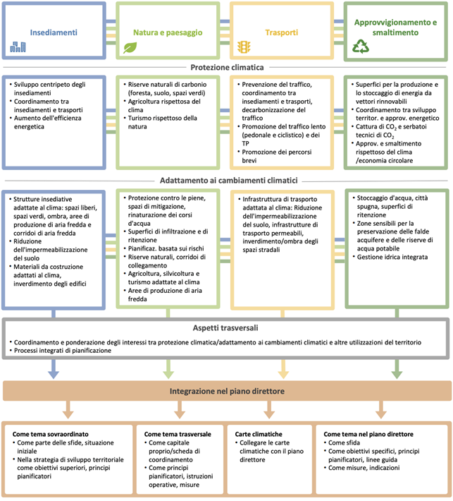 - principi e misure concrete per la protezione del clima e l’adattamento al cambiamento climatico (in un capitolo/una scheda di coordinamento specifico/a sul clima o nei vari capitoli tematici del piano direttore).